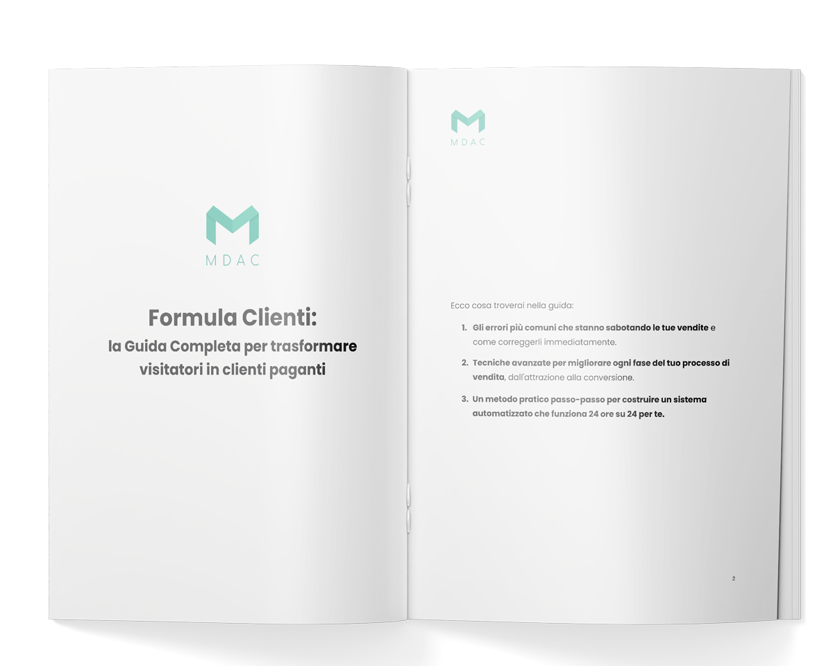 “Formula Clienti” è una strategia che automatizza il processo di acquisizione e conversione dei clienti, consentendoti di ottenere risultati misurabili senza sprecare tempo e denaro.